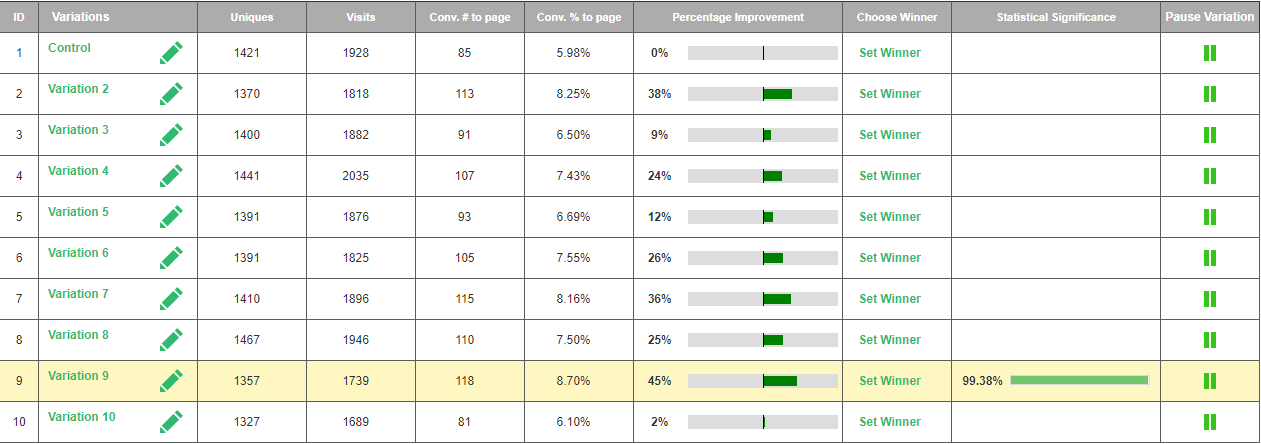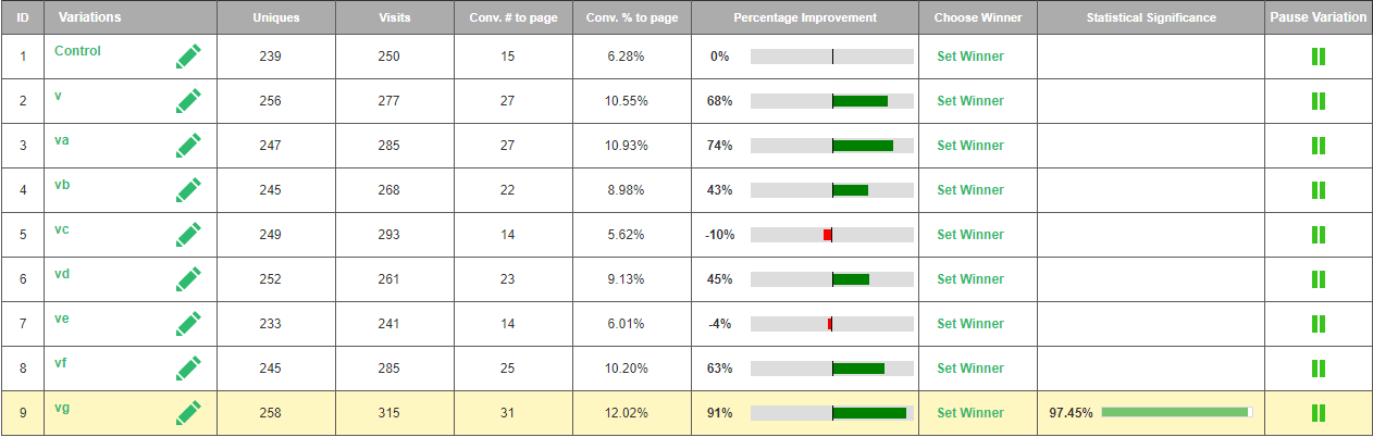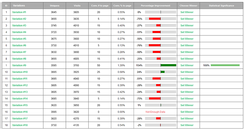 This is what occurs when you test 9 variables 24 variable variations , getting the data that would take more than 4312 split tests, using Visiopt’s™ methodologies.